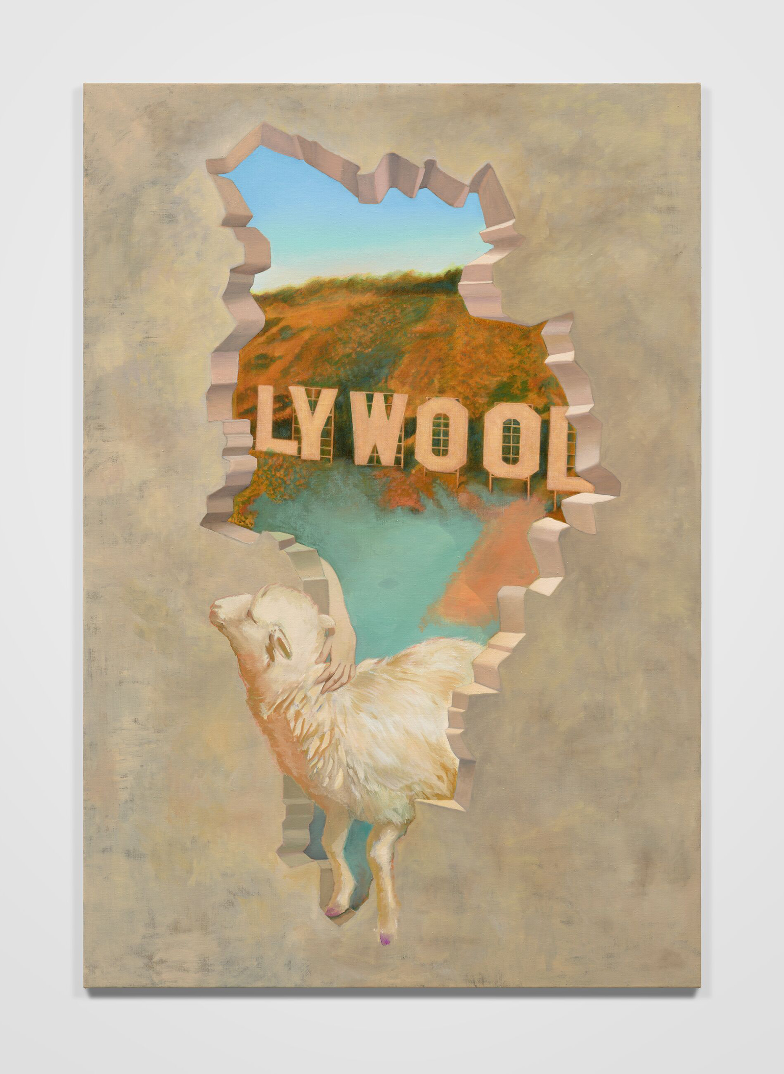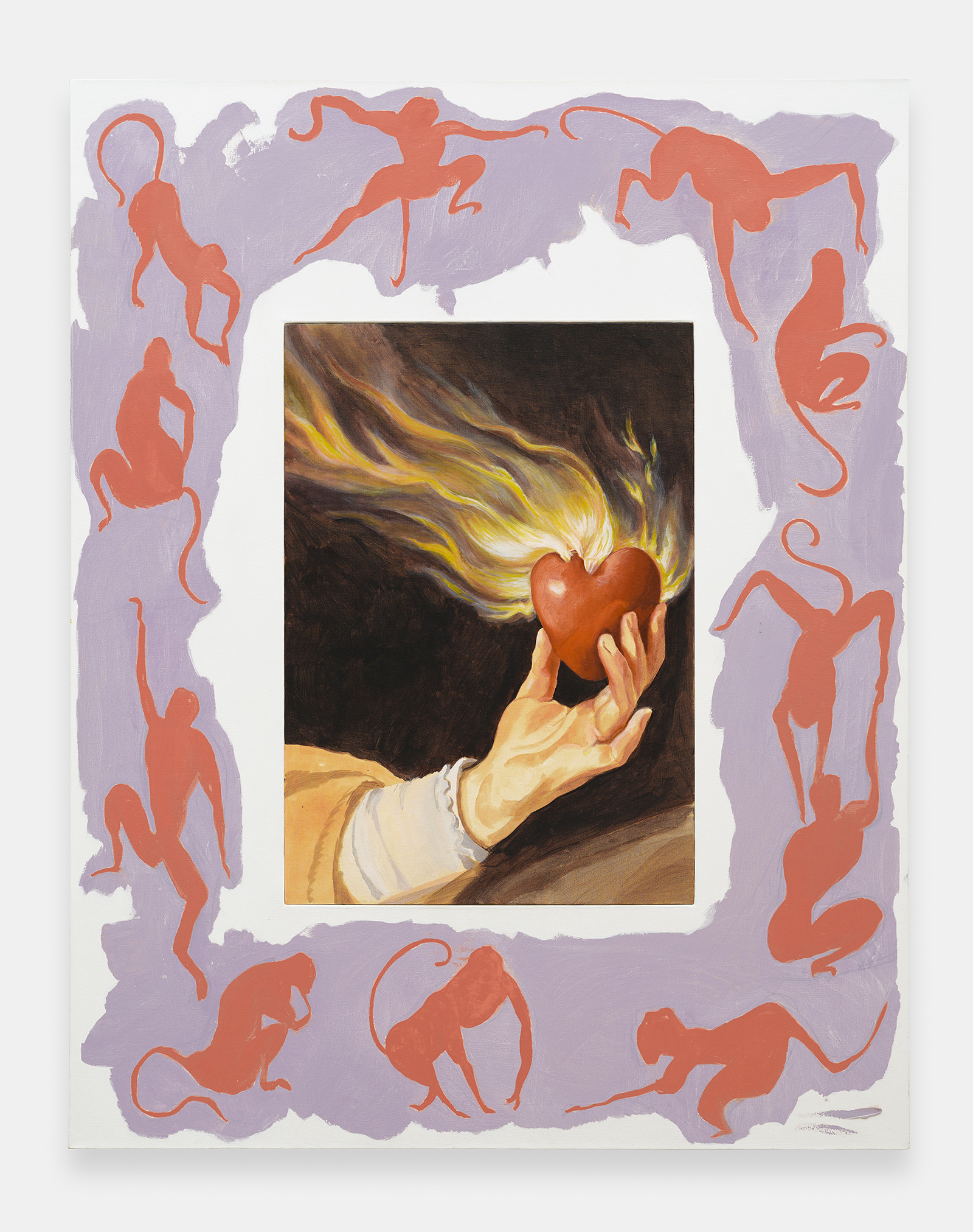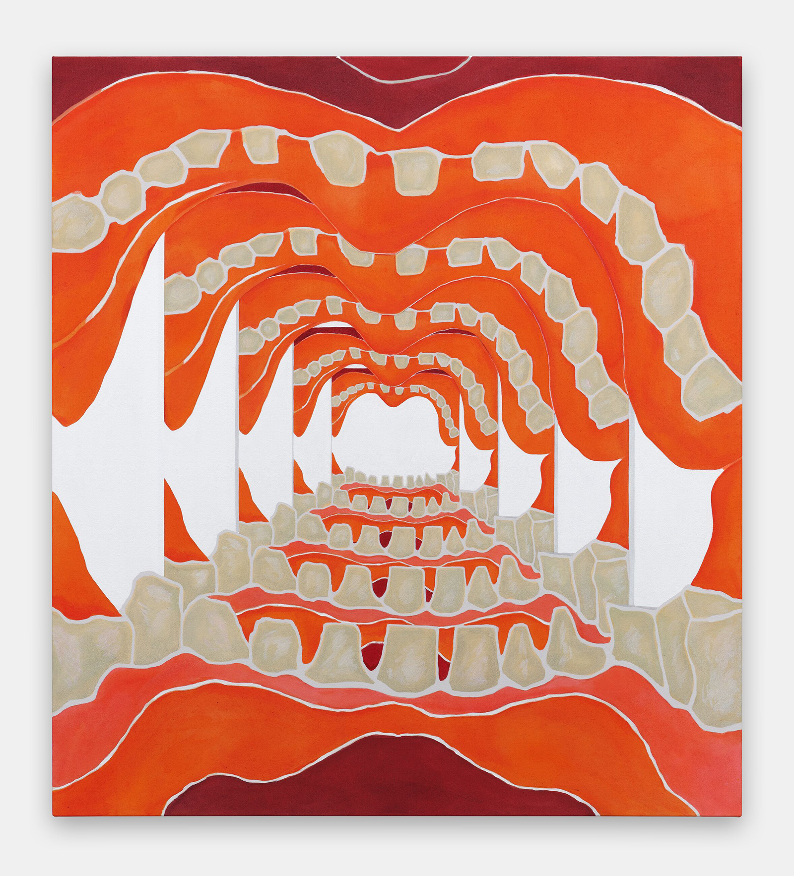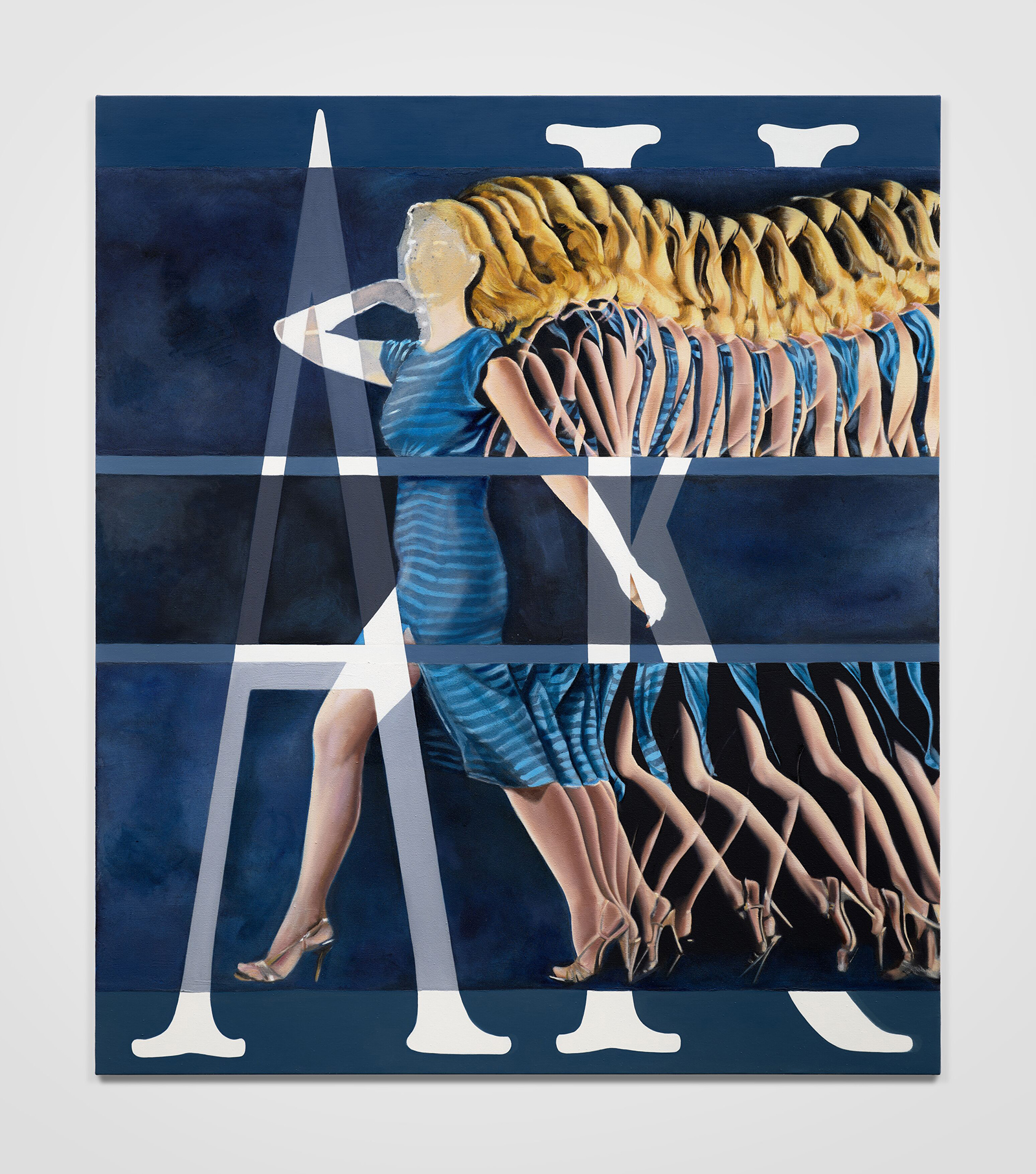 In her paintings, Katz refreshingly interrogates the expectations of narrative representation, implicating contradictions and overlapping imagery that help to disrupt the idea of painting as an illusion of reality. She often refers to specific literary quotes and historical paintings, exploiting wordplay or exploring alternate ways of perceiving a particular object or existing composition. Her paintings range tremendously in terms of style and imagery. Certain devices, references, echoes, and chains of meaning introduce a holistic spirit. For example, Katz makes use of the repetition of certain subjects—cabbages, roosters, mouths, fairies, roads, and noses—to name a few. These symbols can be seen framing or partnering each other, blended as if the canvas has been double exposed, balanced by a lingering profile, or embellished by one of Katz’s puns on her own name. A keen interest in the notion of self-portraiture, the artist’s touch and the myth of the painter, sees Katz deconstructing and including elements of ‘Allison Katz’, her nickname, or initials, to upend the traditional value-appeal of a signature, unequivocally offering a brazen connection with the maker.